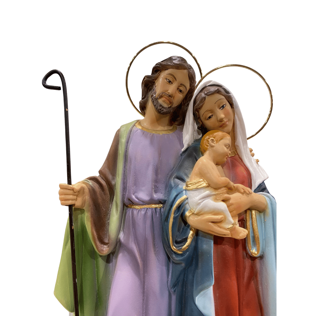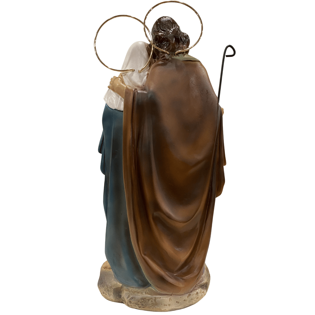 Esta peça tem 31 cm de altura, é feita em resina e apresenta acabamento refinado, com pintura suave e traços harmoniosos. A postura serena das figuras transmite acolhimento e equilíbrio, tornando a imagem uma bela expressão de fé.