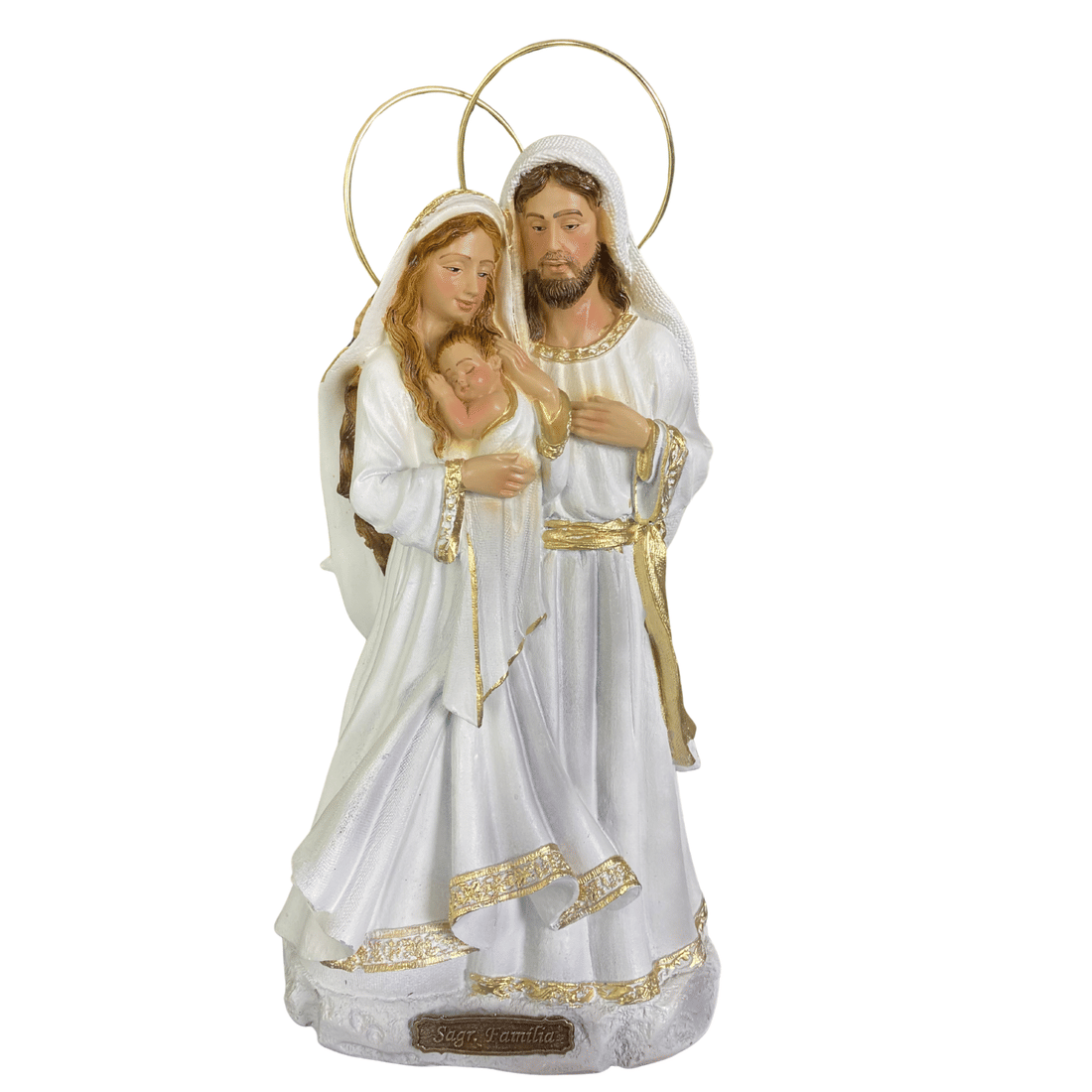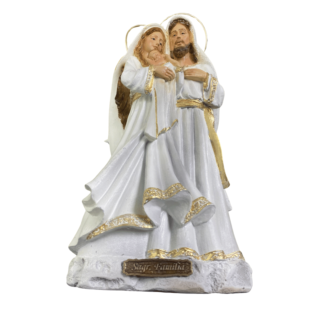 Com sua beleza serena e formas bem definidas, esta imagem da Sagrada Família branca valoriza a arte sacra e compõe com nobreza oratórios, capelas e ambientes religiosos. Uma escultura que expressa, por meio da arte, a reverência e o respeito à tradição cristã, sem recorrer a exageros ou ornamentos excessivos.