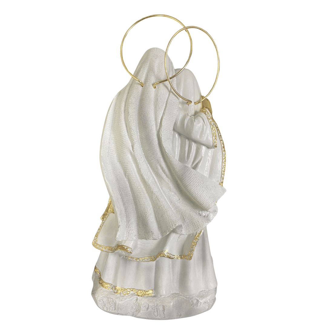 Esta escultura é produzida em resina branca de alta qualidade, medindo 32 cm de altura. A peça apresenta acabamento fino e elegante, com traços suaves e formas harmoniosas. O tom monocromático realça o volume da escultura, evidenciando os detalhes nos mantos, rostos e posturas das figuras sagradas. A resina confere à imagem leveza, durabilidade e precisão no acabamento, sendo ideal para quem aprecia a pureza estética da arte sacra contemporânea.