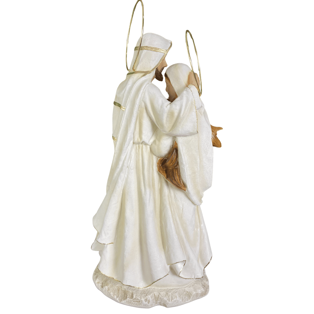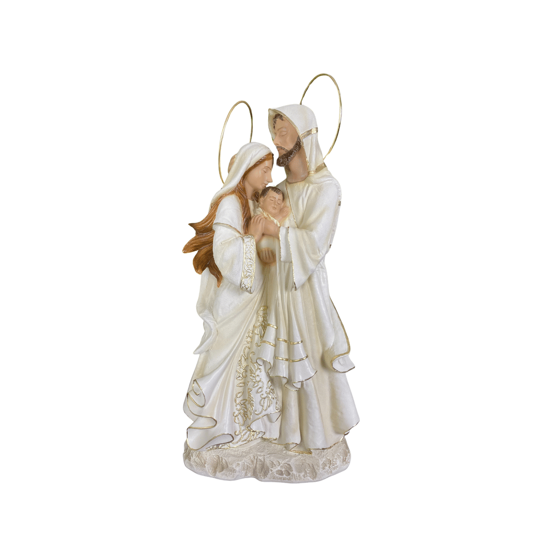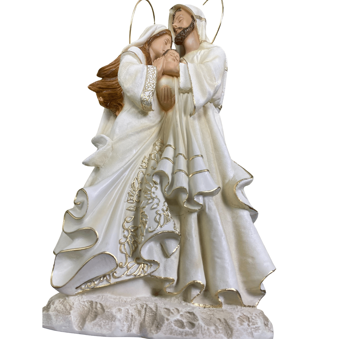 Esta escultura da Sagrada Família é confeccionada em resina de alta qualidade, com 40 cm de altura e acabamento na cor creme, que confere um aspecto delicado, homogêneo e levemente aveludado à peça. Os detalhes são bem definidos: os rostos expressam serenidade, as vestes têm ondulações realistas, e o conjunto apresenta um equilíbrio visual marcante. A resina, por ser leve e resistente, proporciona uma escultura durável, com traços bem trabalhados e excelente definição.