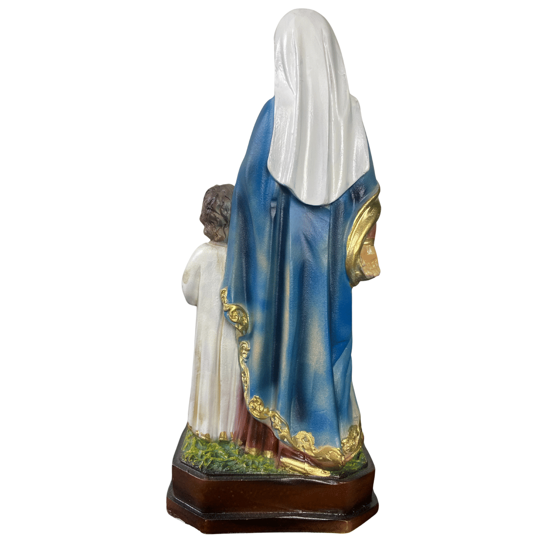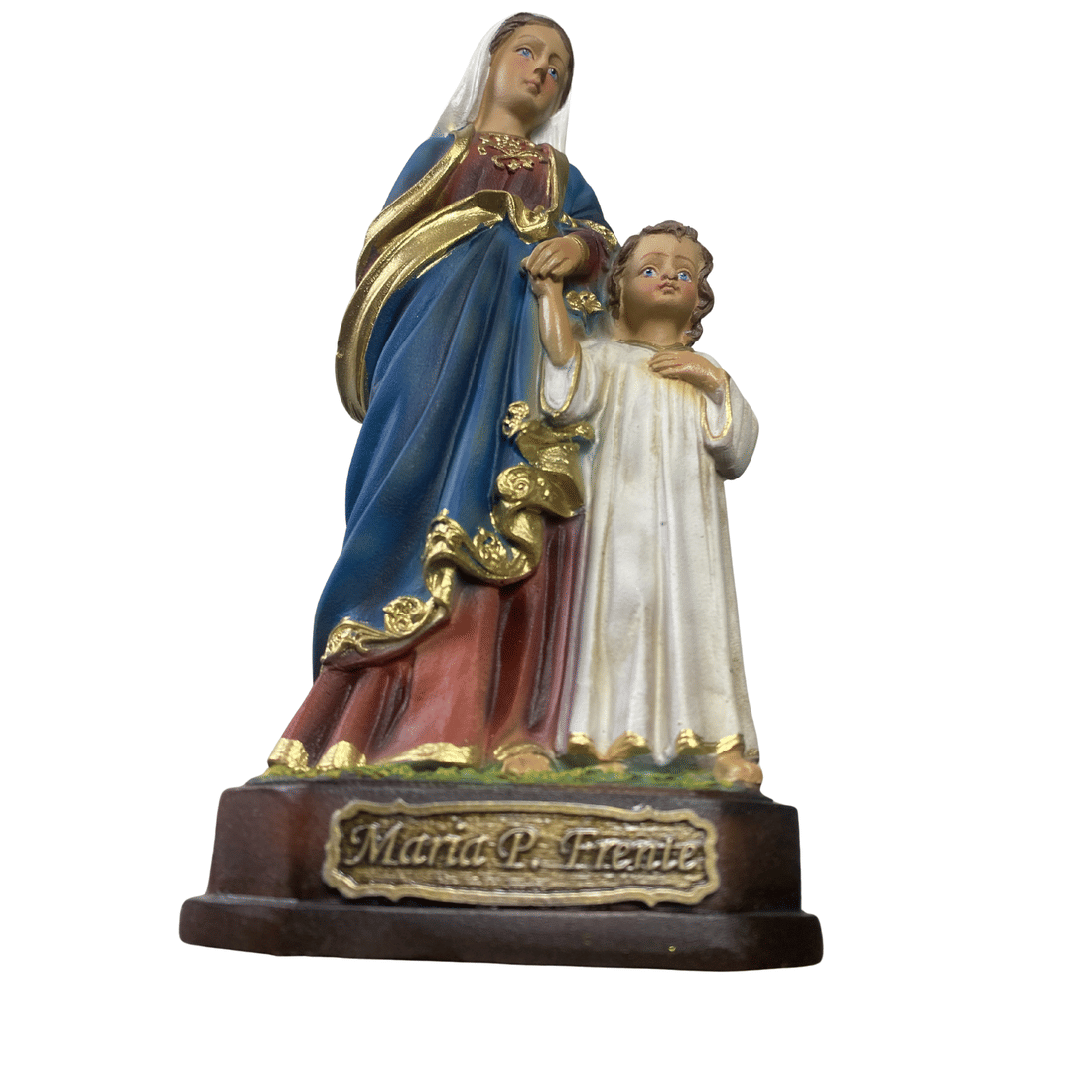 Esta imagem de Maria Passa na Frente é produzida em resina de alta qualidade, com 20 cm de altura, e destaca-se pela pintura refinada e acabamento detalhado. O manto azul com dourado, as dobras das vestes e o semblante materno são realçados com precisão, refletindo o cuidado artístico da escultura. A posição das mãos e o leve movimento da figura transmitem delicadeza e espiritualidade, valorizando cada traço da obra.