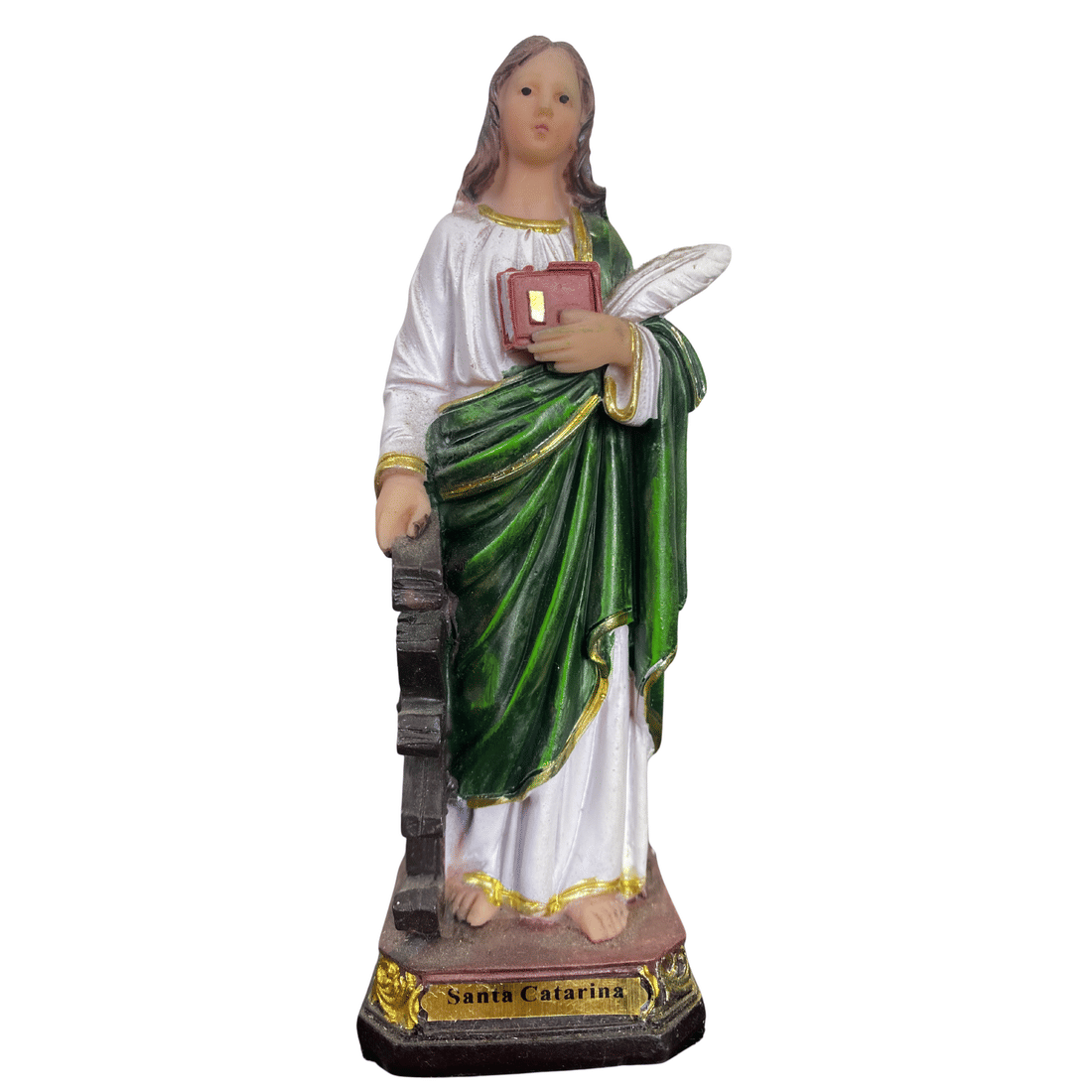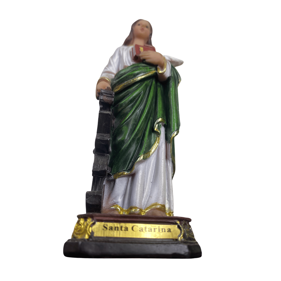 Esta imagem de Santa Catarina é confeccionada em resina de alta qualidade, com 12 cm de altura. Apesar do tamanho compacto, a peça apresenta pintura refinada e grande riqueza de detalhes. Os elementos característicos da santa — como a coroa, o manto, a espada e a roda — são fielmente representados com acabamento cuidadoso e traços bem definidos. A leveza da resina permite versatilidade, enquanto o trabalho artístico valoriza a expressão serena e firme da santa.