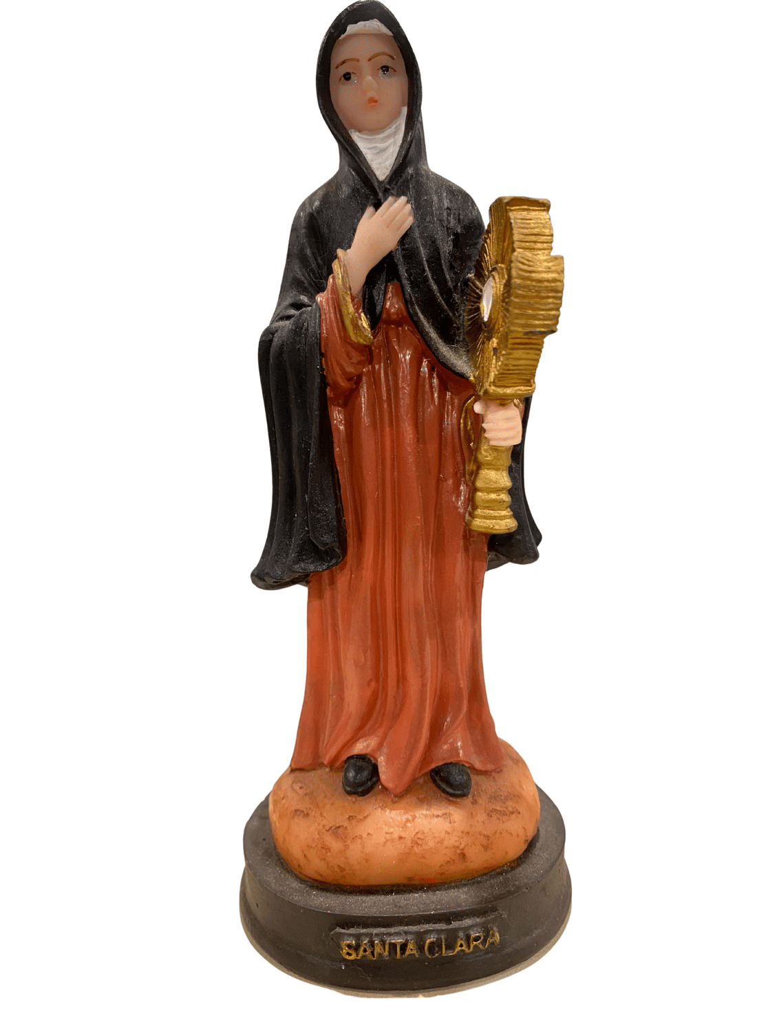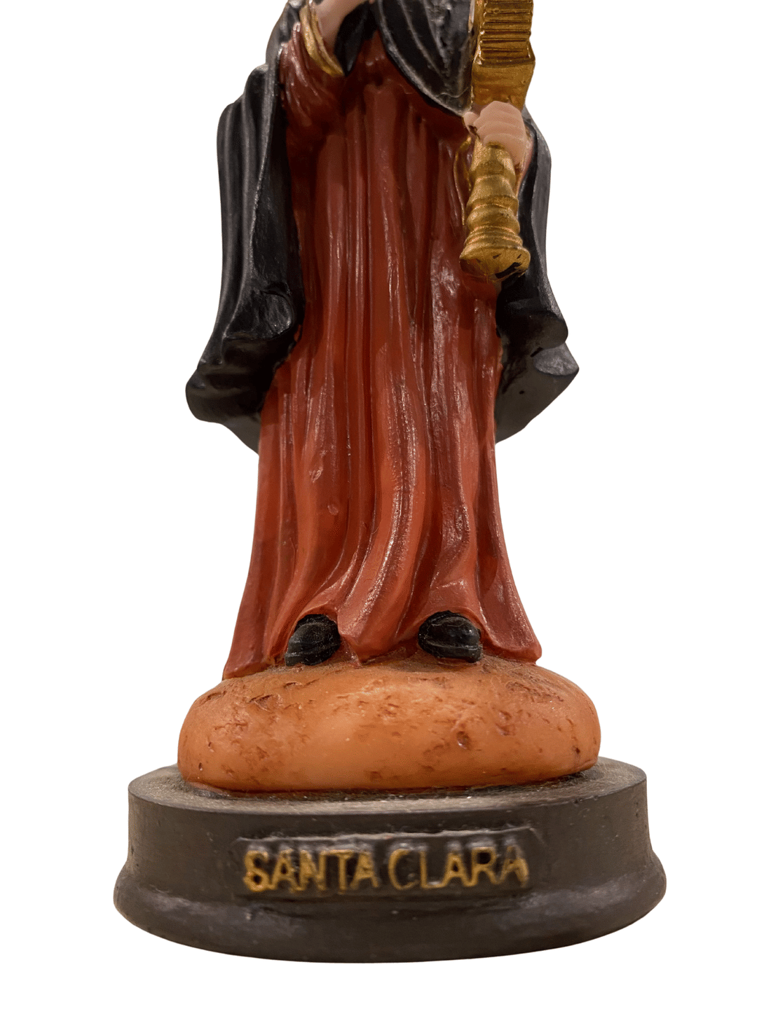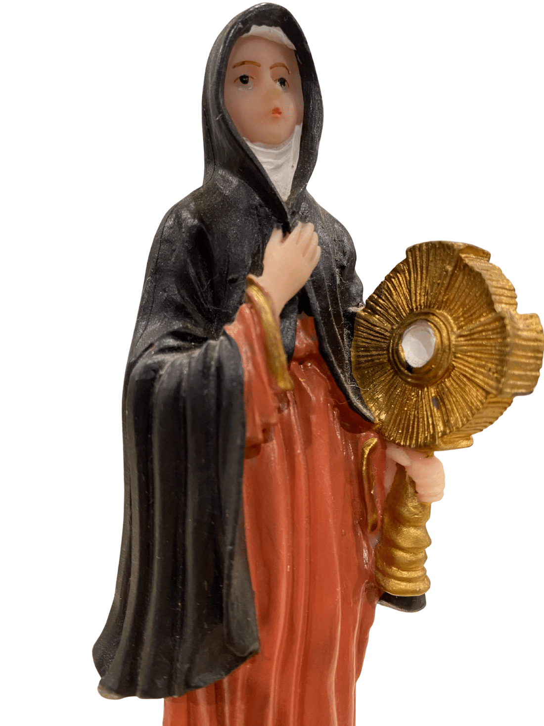 Confeccionada em resina, esta imagem possui 15 centímetros de altura. A pintura é aplicada manualmente, com tons sóbrios que realçam o hábito religioso, o rosto sereno e o ostensório em suas mãos. O acabamento é refinado, com atenção aos detalhes, garantindo beleza e fidelidade à representação tradicional da santa.