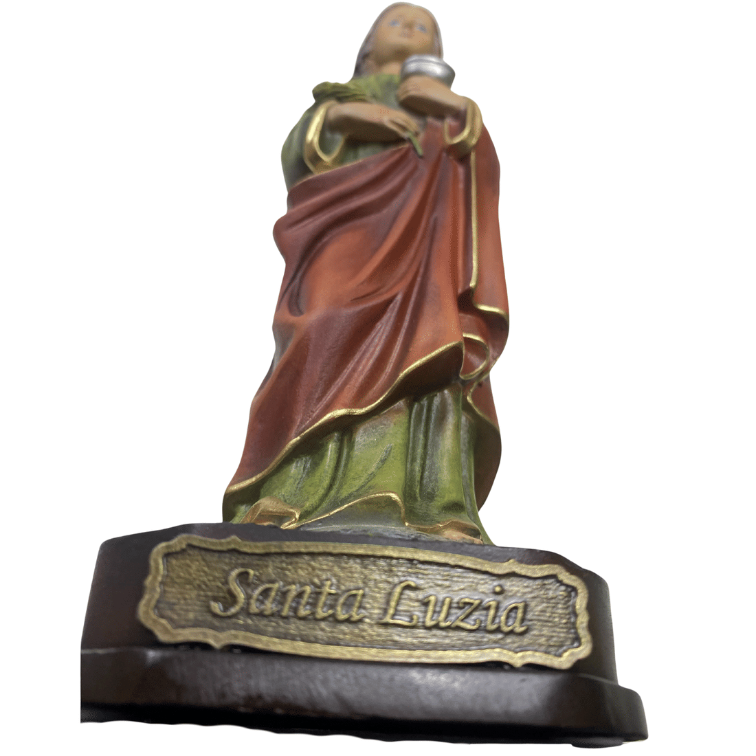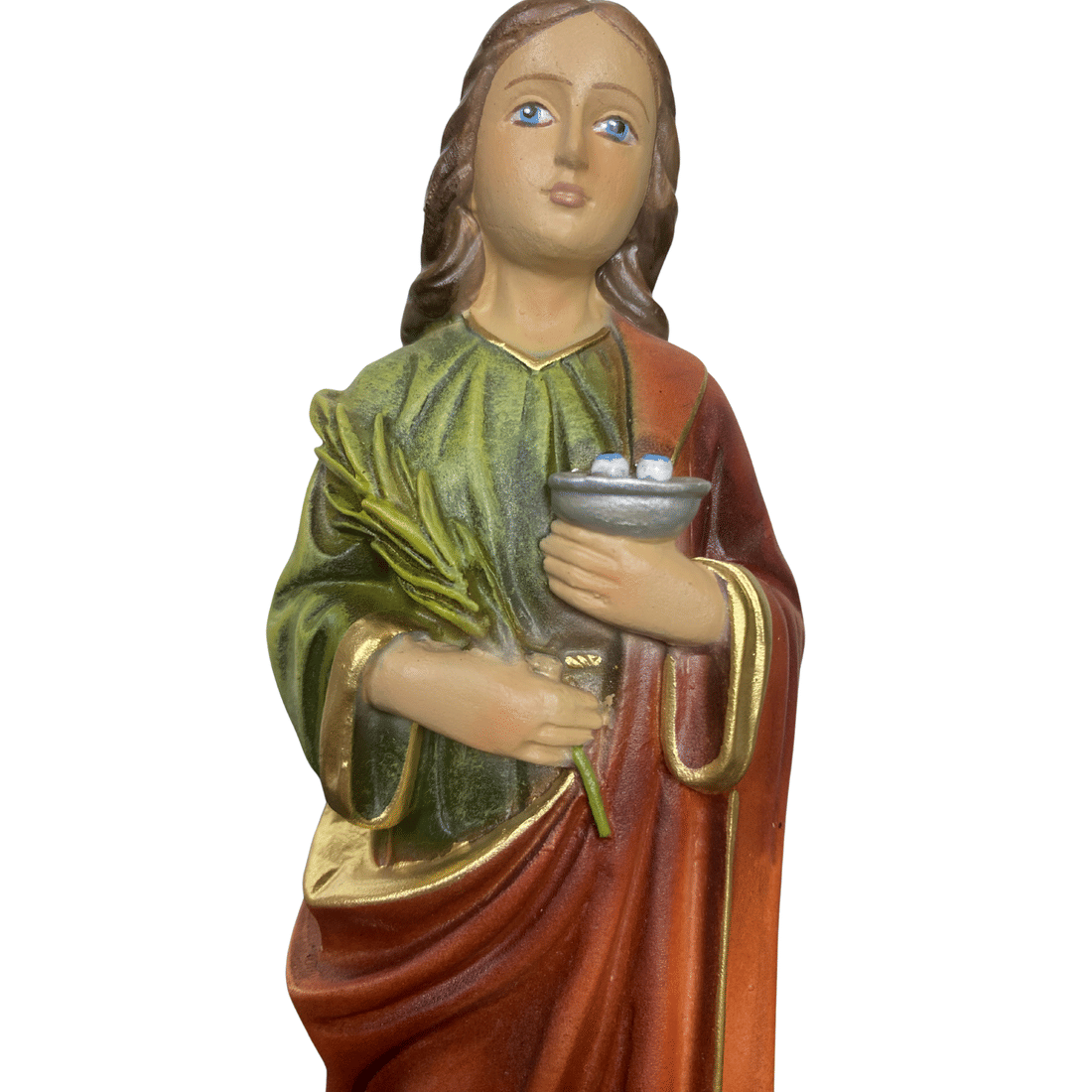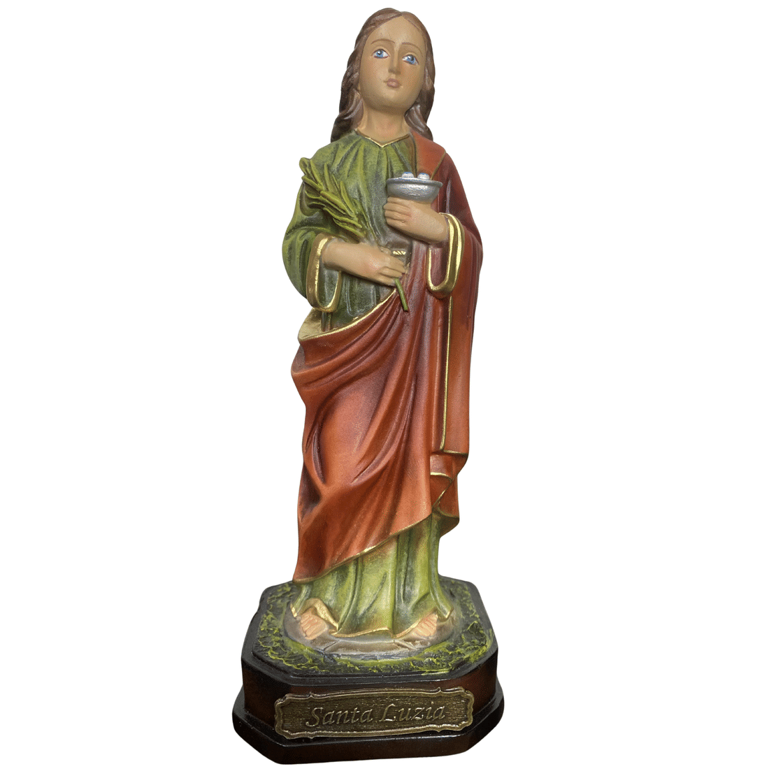 Esta escultura é produzida em resina de alta qualidade, com 20 cm de altura, e recebe uma pintura manual refinada, que valoriza os elementos tradicionais de sua iconografia, como o manto, a palma e o prato com os olhos. O acabamento é cuidadoso e expressivo, com traços suaves e bem definidos que preservam a serenidade do rosto e a elegância das vestes. A resina garante leveza, resistência e excelente qualidade visual para ambientes internos.