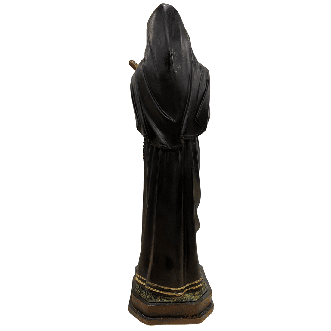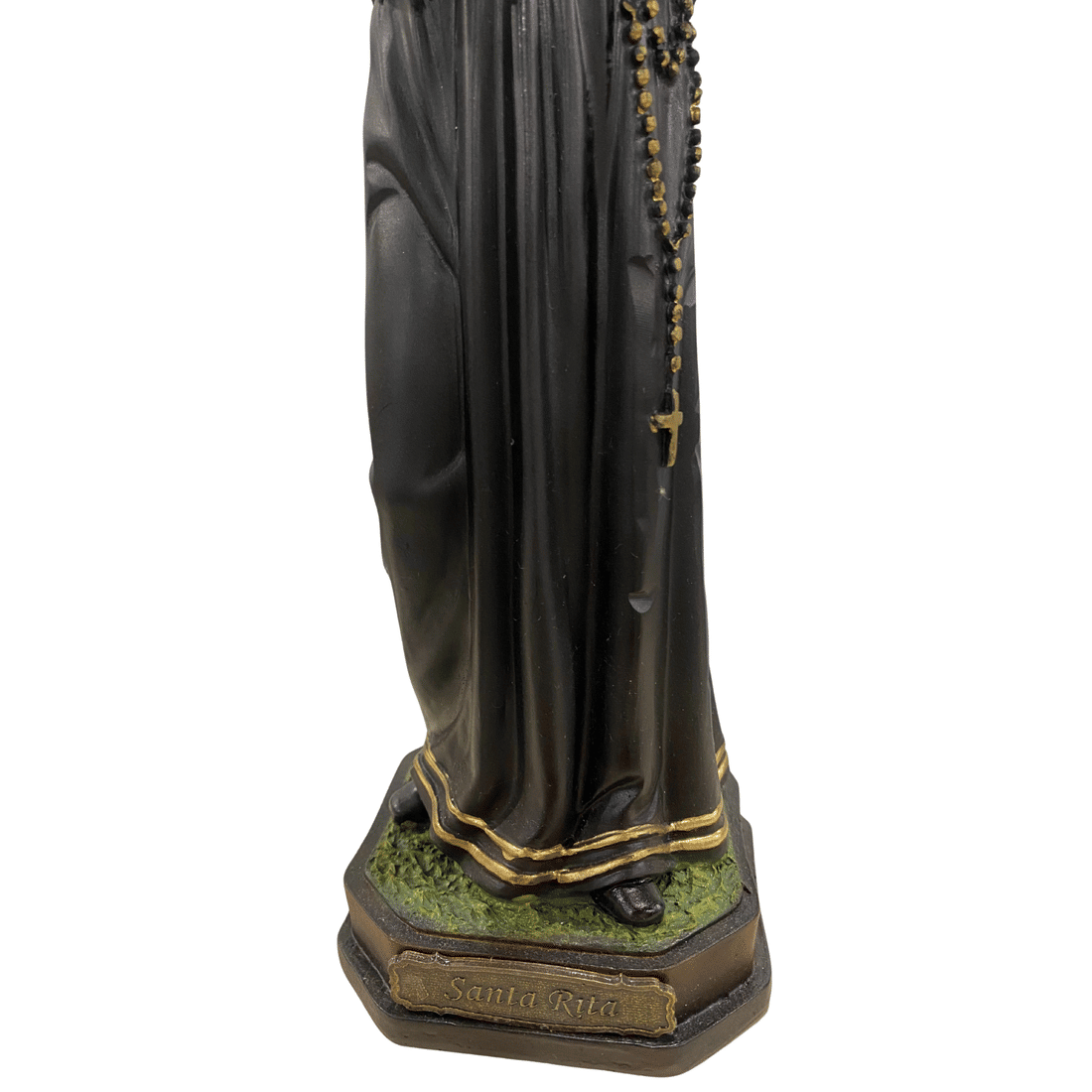 Com 30 cm de altura, esta imagem em resina representa Santa Rita com o tradicional hábito agostiniano, segurando o crucifixo e com a marca da ferida na testa. A escultura apresenta traços suaves e pintura discreta, transmitindo serenidade e recolhimento espiritual.