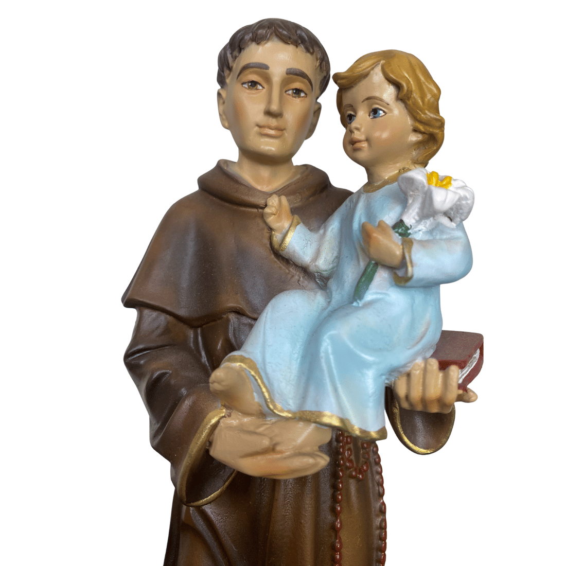 Esta imagem de Santo Antônio é confeccionada em resina de alta qualidade, com 32 cm de altura, e possui pintura manual refinada, realçando os detalhes do hábito franciscano, do Menino Jesus, do livro e do lírio. O acabamento é cuidadosamente elaborado, com atenção às expressões faciais e à fluidez das vestes, refletindo a serenidade e a firmeza espiritual do santo. A resina proporciona leveza, resistência e fidelidade na reprodução dos elementos artísticos da escultura.