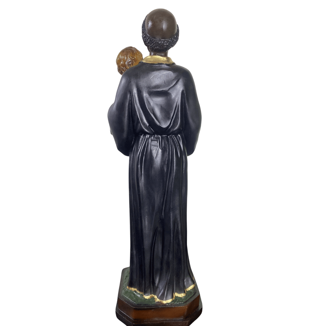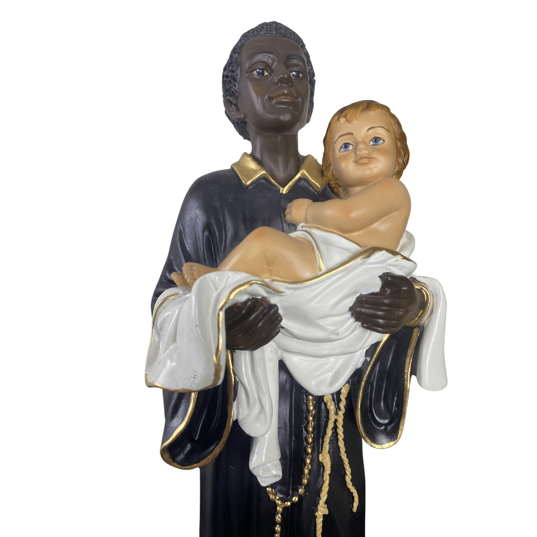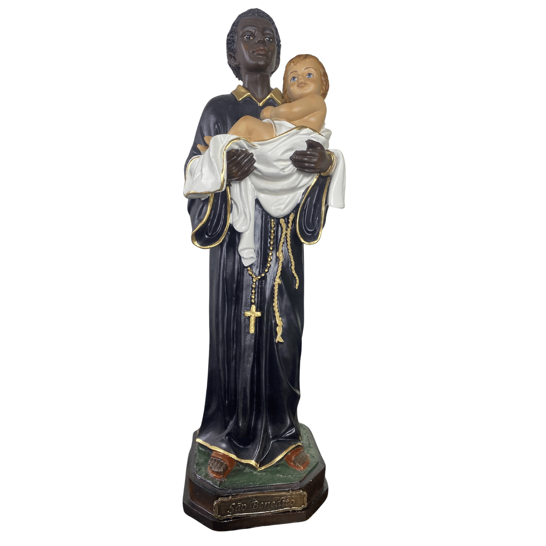Esta escultura de São Benedito é confeccionada em resina de alta qualidade, com 30cm de altura. A pintura é refinada, com destaque para as vestes do hábito franciscano, o menino Jesus nos braços e os traços serenos do rosto do santo. A riqueza de detalhes e o acabamento cuidadoso valorizam a peça, conferindo realismo e profundidade à expressão. A base é proporcional e firme, completando a obra com elegância e equilíbrio.