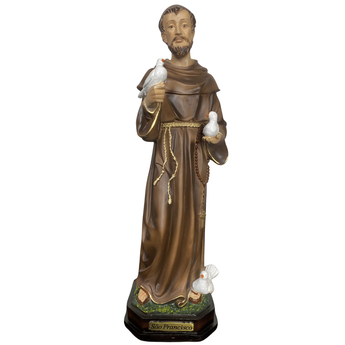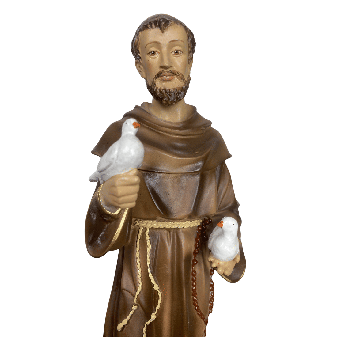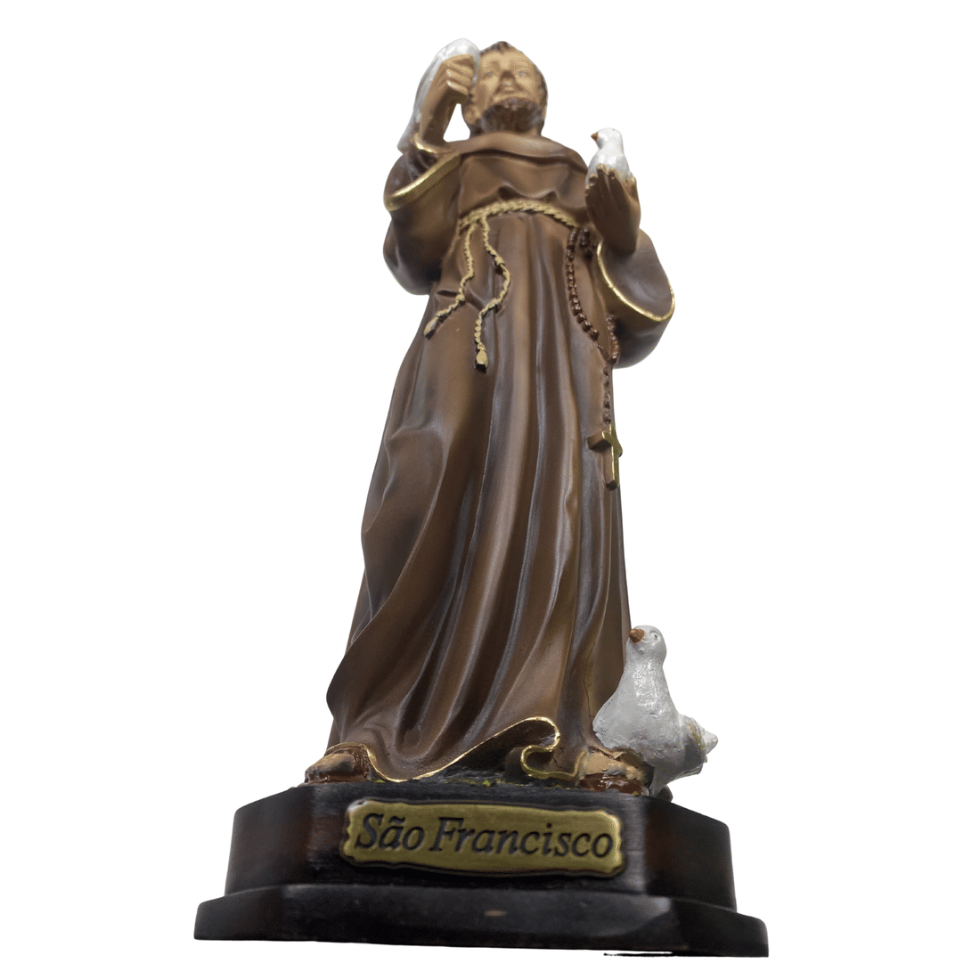 Esta imagem é confeccionada em resina de alta qualidade, com 22 cm de altura, e apresenta uma pintura manual refinada, destacando o hábito marrom característico, a expressão pacífica do rosto e os detalhes dos elementos naturais aos seus pés, como pássaros ou cordeiros. A escultura mantém fidelidade iconográfica e proporções equilibradas, revelando o cuidado artesanal em cada traço. A resina confere durabilidade e leveza, tornando a peça ideal para ambientes internos.