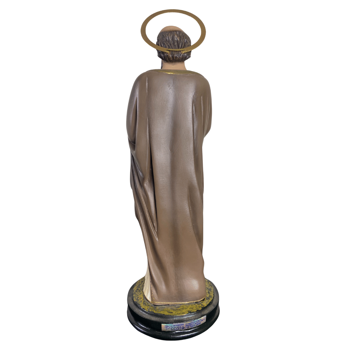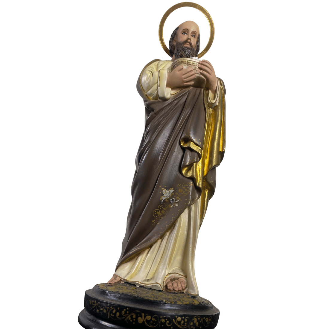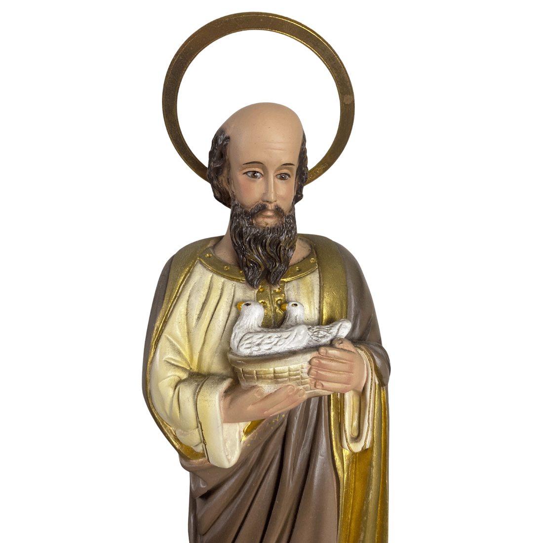 Esta escultura de São Joaquim é confeccionada em resina de alta qualidade, com 30 cm de altura. A pintura é feita de forma refinada, destacando os detalhes da veste, expressão facial serena e os traços realistas da escultura. O acabamento é meticuloso, valorizando cada elemento iconográfico que compõe a imagem, como o semblante contemplativo e o pergaminho nas mãos, símbolo da sabedoria. A base é discreta, dando equilíbrio e elegância à peça.