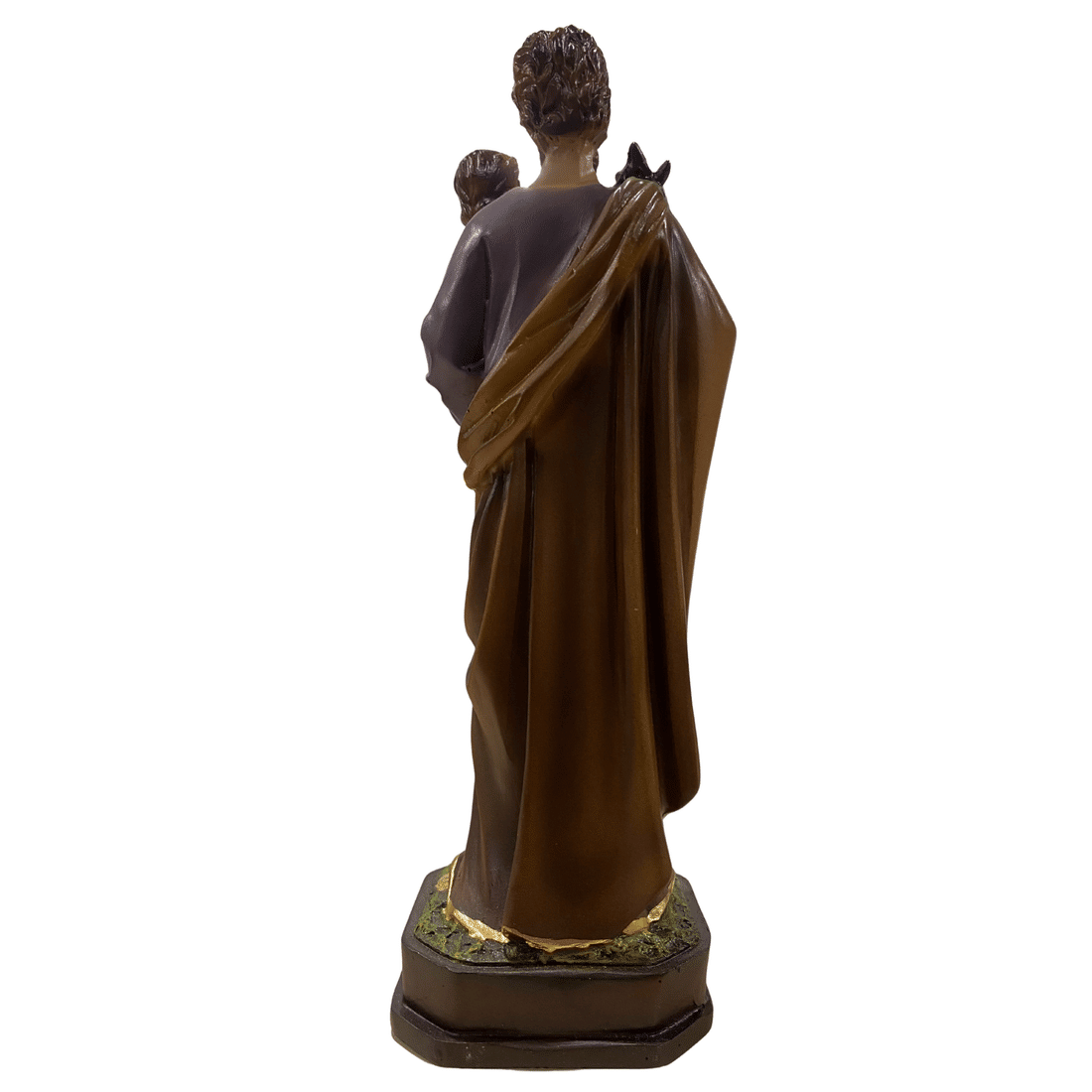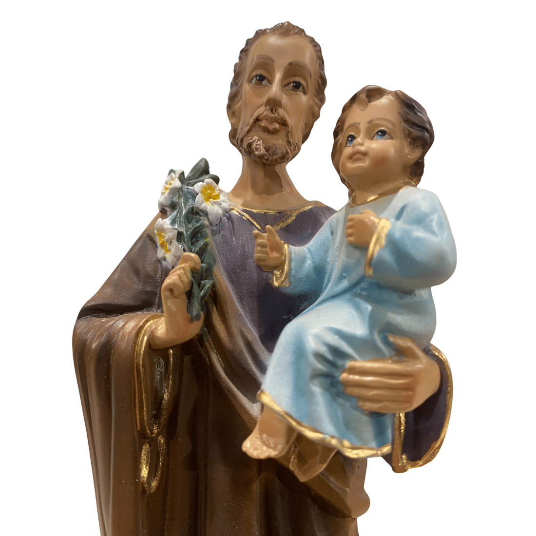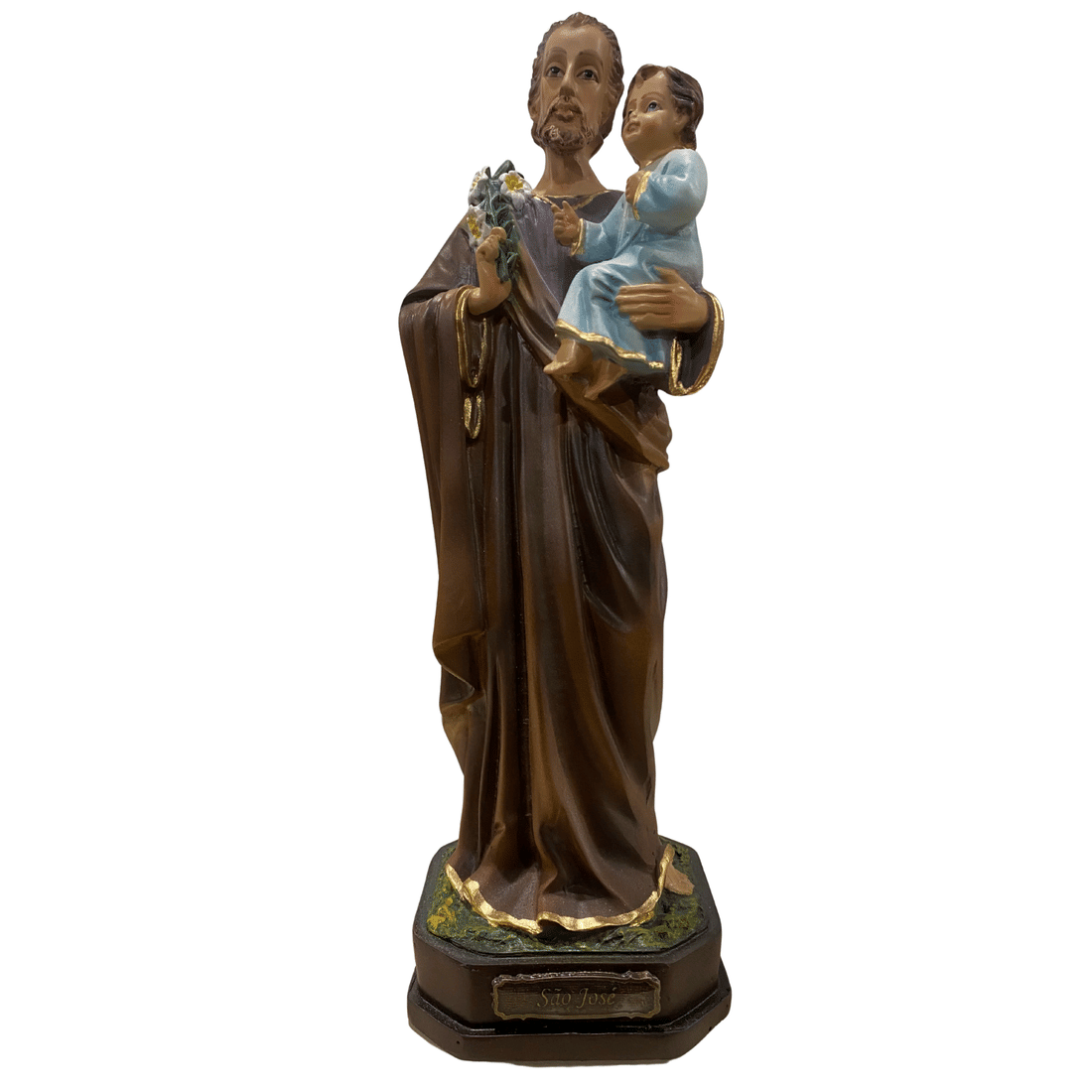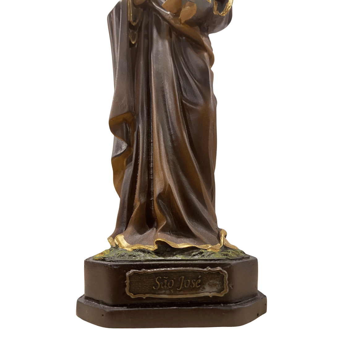 Confeccionada em resina, esta representação apresenta acabamento delicado e expressão serena, evidenciando os traços do santo e medindo 22 centímetros.