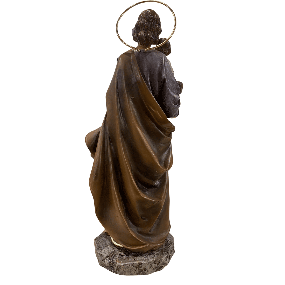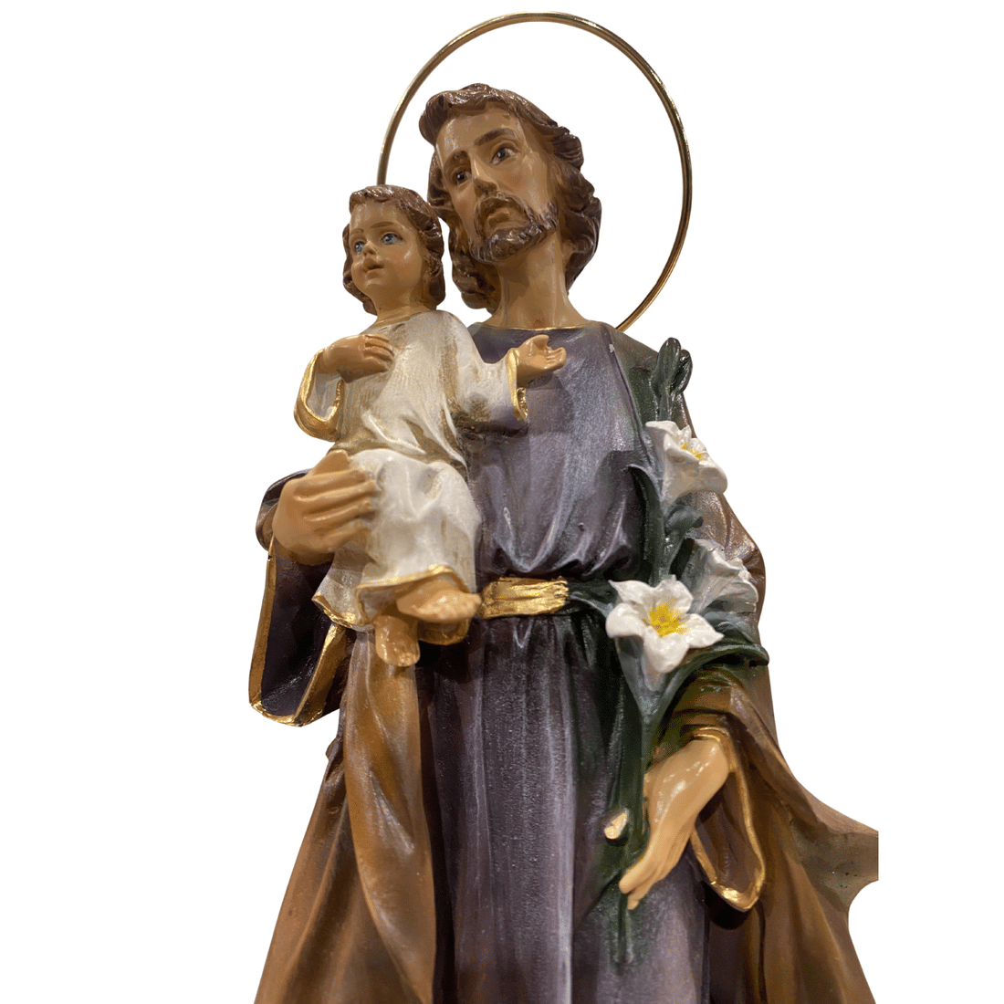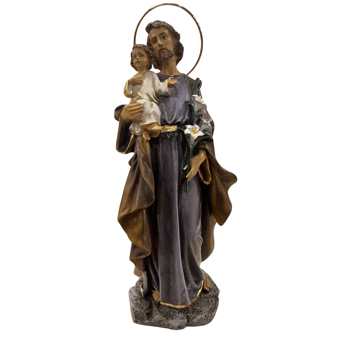 Confeccionada em resina, esta representação possui acabamento delicado e expressão serena, valorizando os detalhes da imagem de São José e medindo 25 centímetros.
