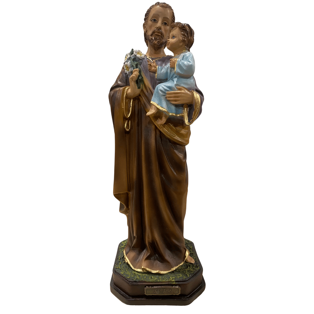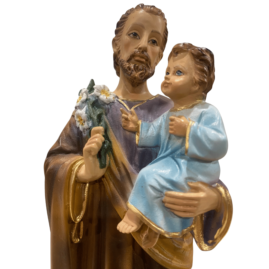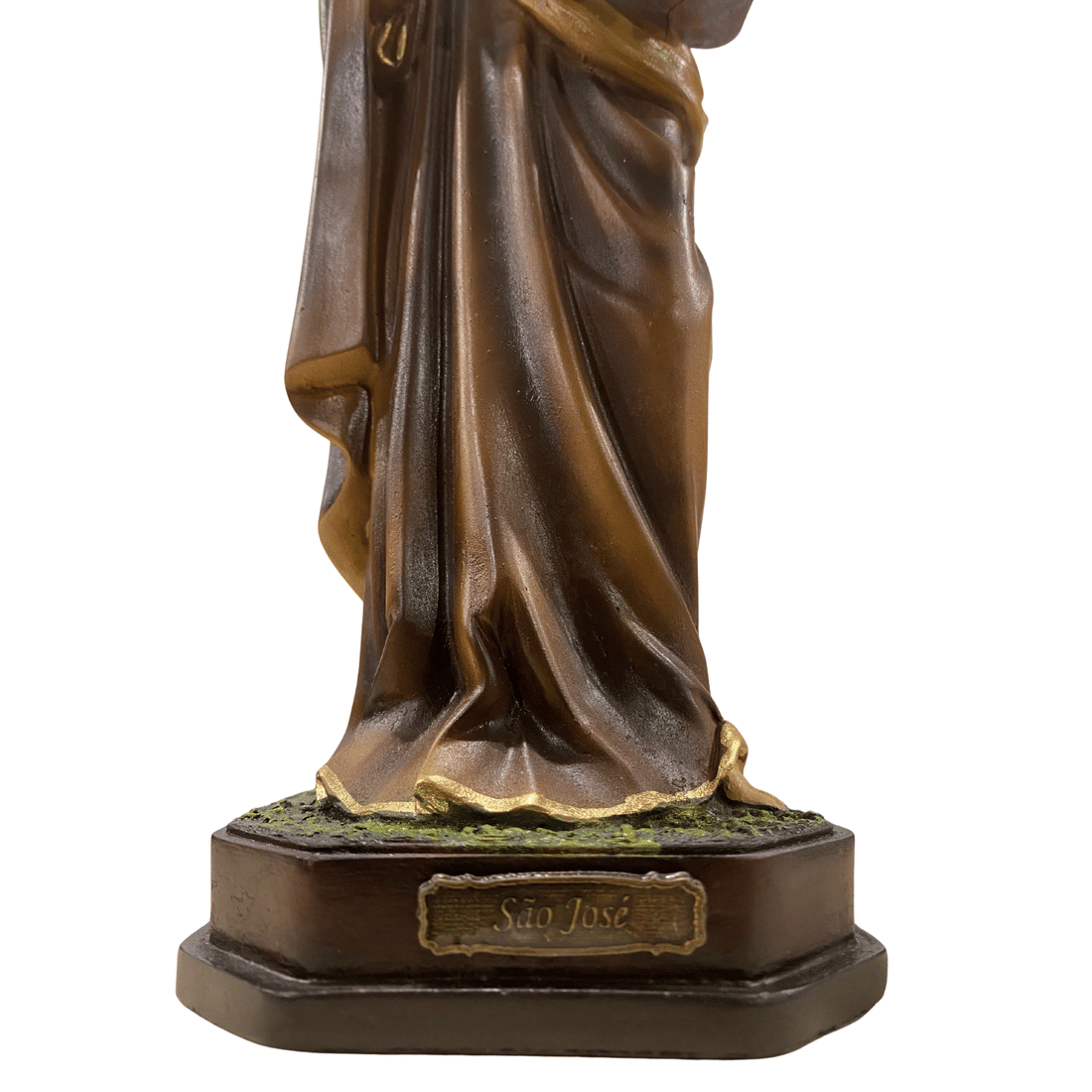Confeccionada em resina, esta representação possui acabamento delicado e expressão serena, valorizando os detalhes da imagem de São José e medindo 30 centímetros.
