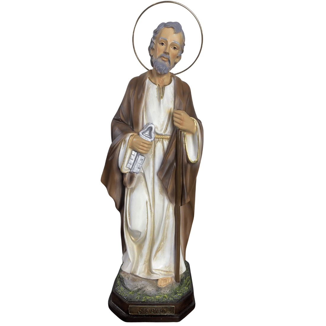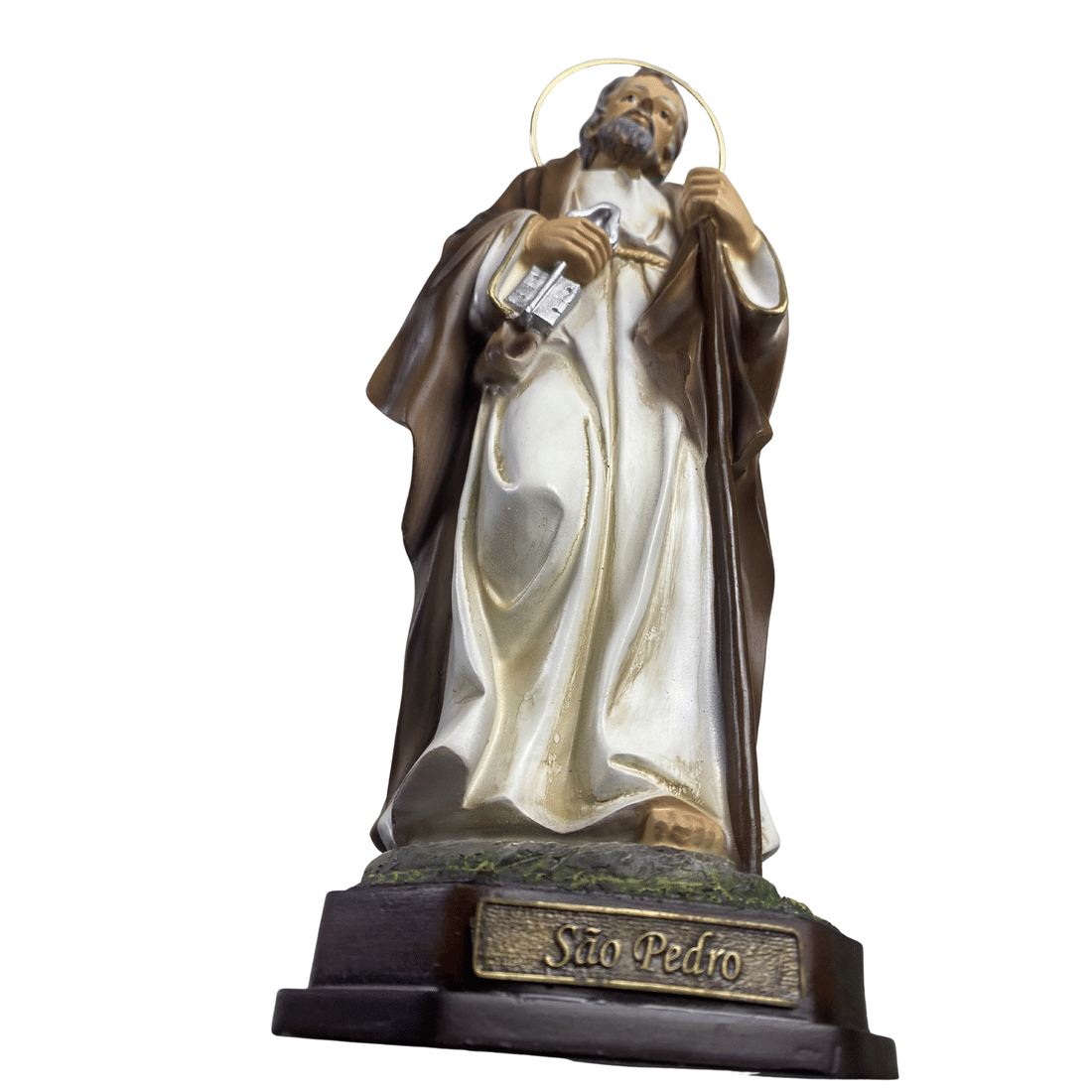 A imagem de São Pedro é confeccionada em resina de alta qualidade, com 30 cm de altura. A escultura apresenta pintura refinada, com destaque para os símbolos que o representam: as chaves do Reino dos Céus e o manto em tons ricos e detalhados. O acabamento é primoroso, com atenção aos traços faciais, à postura solene e aos elementos que reforçam sua autoridade apostólica. A base proporciona equilíbrio e valoriza a composição.