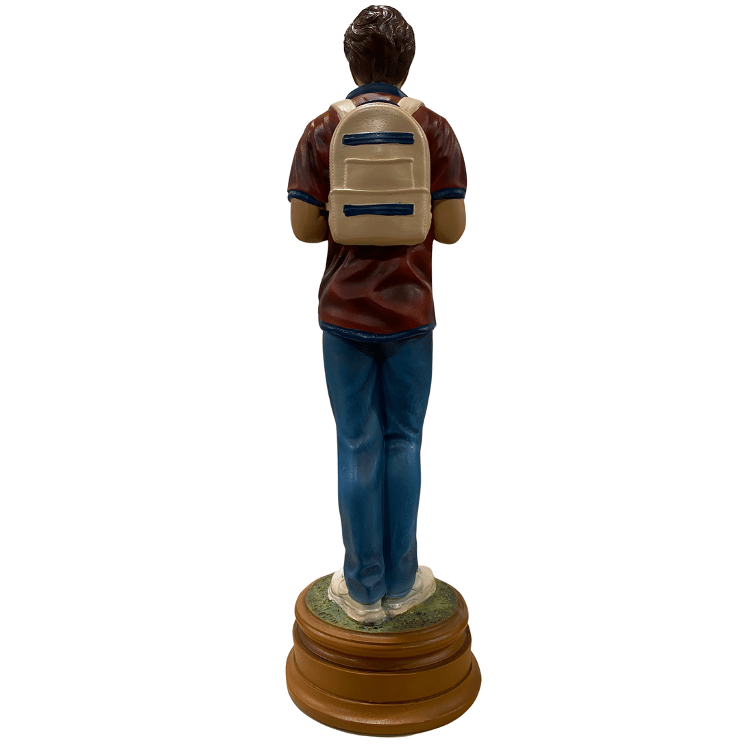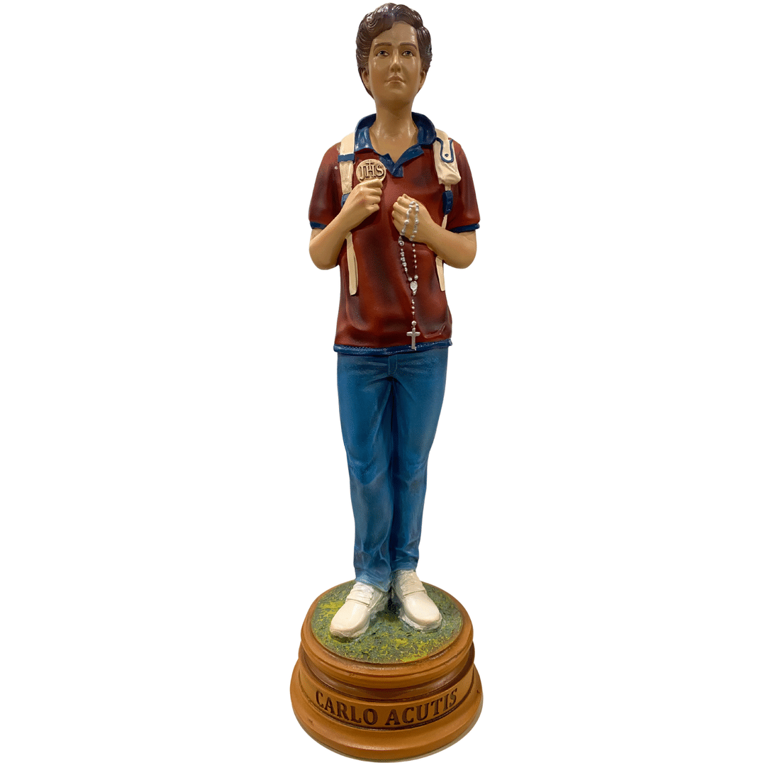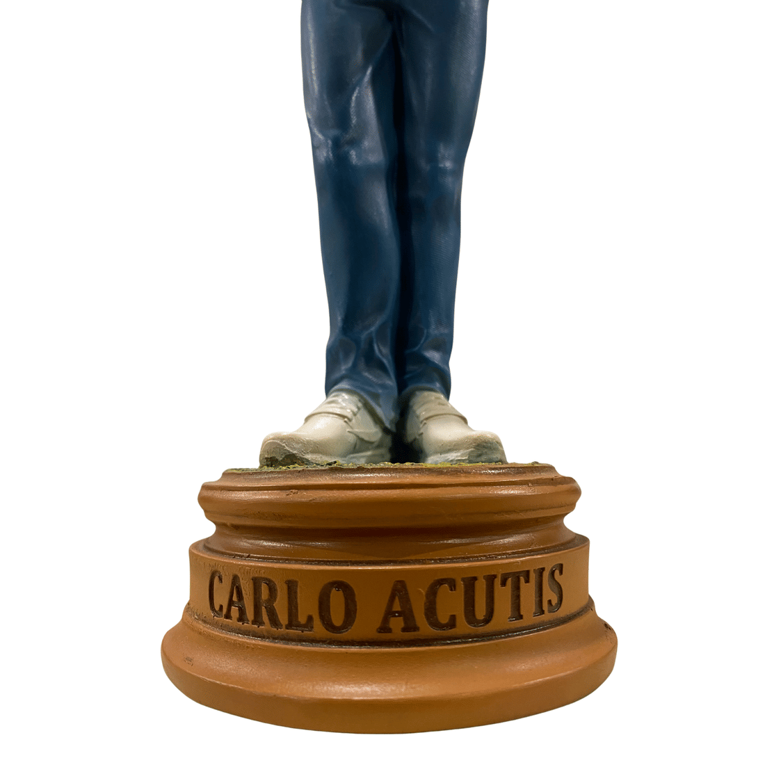 Produzida em resina, com 33 cm de altura, esta peça traz traços harmoniosos, pintura suave e riqueza de detalhes. A postura e a expressão do rosto transmitem leveza e paz, refletindo o espírito do jovem beato que dizia: “A Eucaristia é a minha estrada para o céu.”