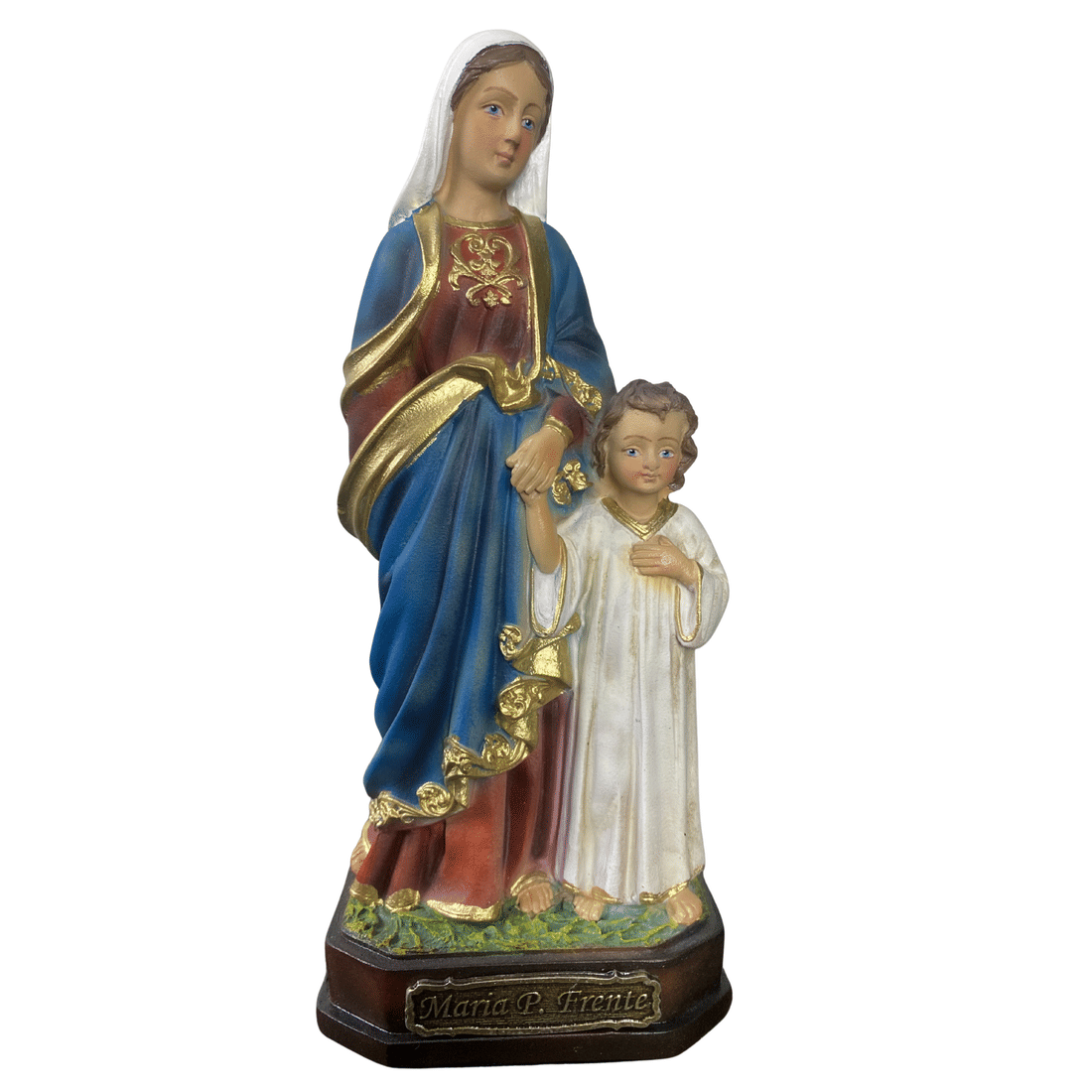 Esta imagem de Maria Passa na Frente é produzida em resina de alta qualidade, com 20 cm de altura, e destaca-se pela pintura refinada e acabamento detalhado. O manto azul com dourado, as dobras das vestes e o semblante materno são realçados com precisão, refletindo o cuidado artístico da escultura. A posição das mãos e o leve movimento da figura transmitem delicadeza e espiritualidade, valorizando cada traço da obra.