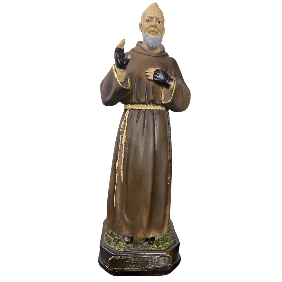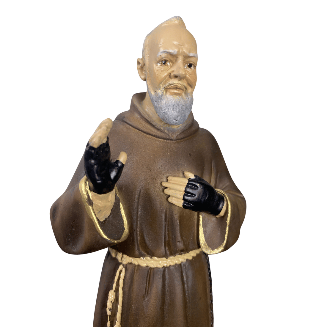 A peça respeita a iconografia tradicional de Padre Pio e valoriza a arte sacra católica, sendo apropriada para compor pequenos oratórios, capelas ou ambientes religiosos. Seu tamanho compacto favorece a disposição em espaços diversos, sem abrir mão da beleza e do significado simbólico que a escultura transmite.