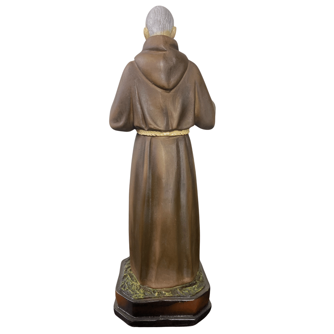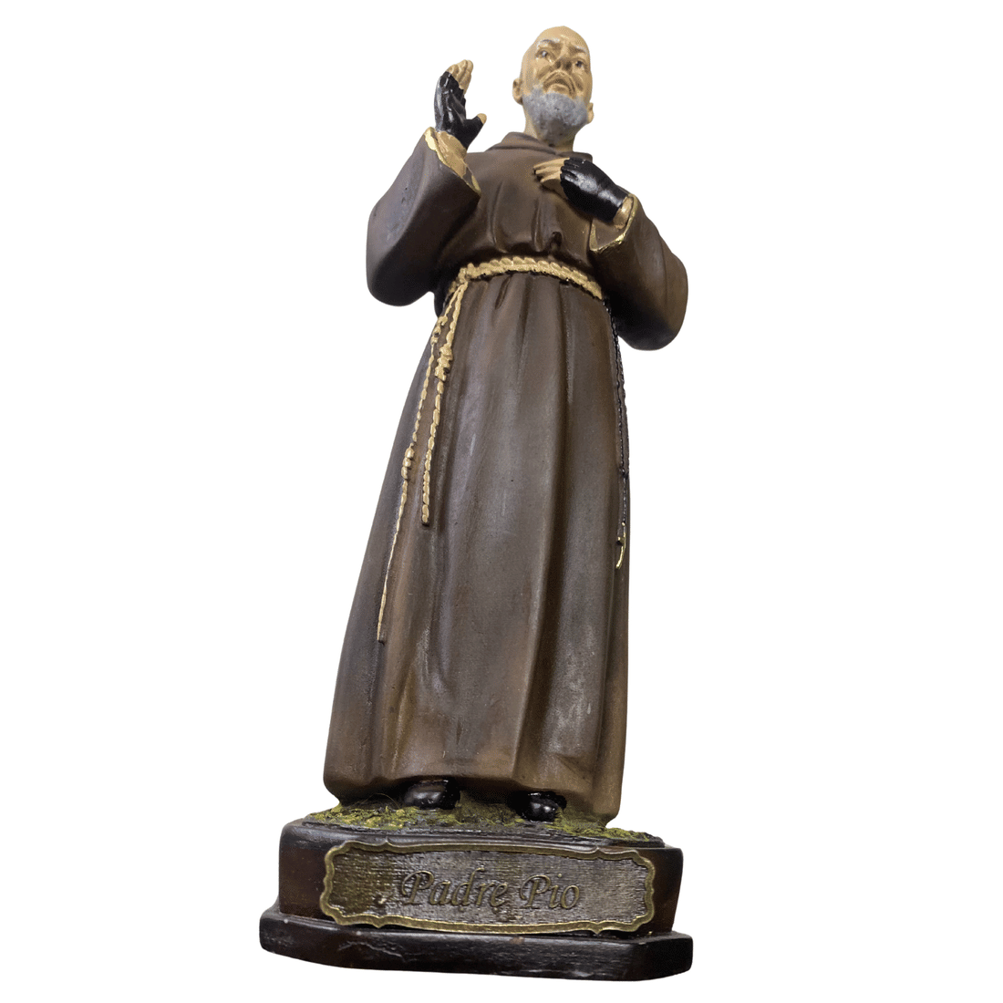 Esta imagem de Padre Pio é confeccionada em resina, com 20 cm de altura. Apresenta acabamento refinado, com riqueza de detalhes na representação do hábito franciscano, no semblante sereno e nas mãos marcadas pelos estigmas. A pintura é cuidadosamente aplicada, valorizando os tons sóbrios e realçando a expressão espiritual do santo. O trabalho técnico revela equilíbrio entre devoção e qualidade artística.